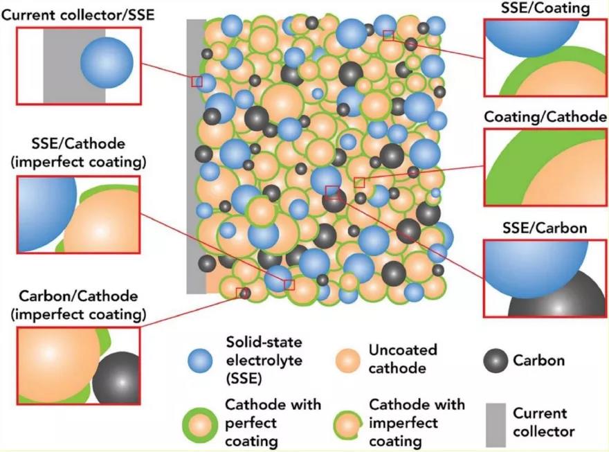 包覆層應均勻且完全覆蓋正極顆粒,并保證正極顆粒之間的接觸以提供導電網絡。硬而脆的包覆層在電極制造過程中易形成裂紋,因此形成顆粒接觸,但可能導致SE分解。如果包覆層是塑性且可變形,則它可以通過變形而形成新的接觸點而不會形成裂紋。表面包覆應抑制或適應正極材料的體積變化,以保持顆粒間的接觸。另外,正極活性材料和SE之間也可能相互擴散。包覆會抑制這種相互擴散,減輕電阻性界面的形成。