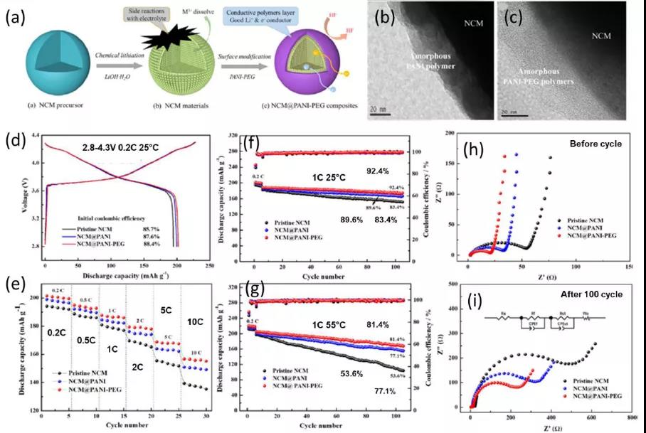 導電聚合物包覆可以形成具有高電子電導率的均勻薄膜,改善正極/電解質界面的電荷轉移。這類聚合物可以適應體積變化,減少裂紋形成。圖8顯示PANI-PEG包覆的LiNi0.8Co0.1Mn0.1O2(NCM-811)。PANI-PEG具有高離子電導率和電子電導率。倍率性能提高可歸因于電子電導率和電荷轉移的提高。循環(huán)性能也有所提高,歸因于副反應被抑制。