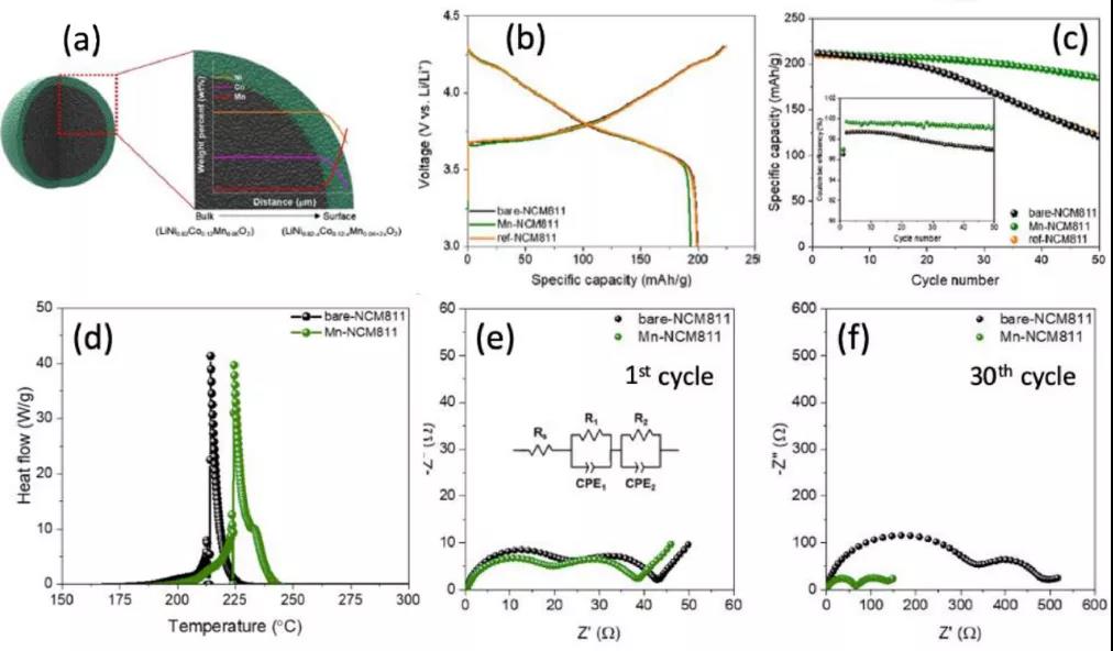 表面包覆方法是在正極表面形成物理阻擋層,通常對電解質的反應性較小,因此改善了材料的結構和熱穩(wěn)定性。由于晶體結構以及界面處的成分變化是相似的,表面摻雜不會阻礙Li+擴散,降低了Rct以及界面處的機械應力,減少了開裂的可能。圖9顯示了錳表面摻雜的富鎳正極。富錳層通過抑制副反應有效穩(wěn)定了富鎳表面,最終改善了熱,結構和電化學性能。新形成的表面穩(wěn)定性高,同時保持了高離子傳輸性能。