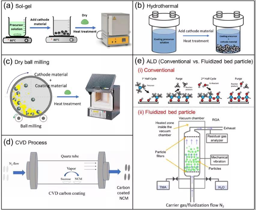 溶膠凝膠包覆工藝通常用于合成正極材料以及表面包覆。然而,由于使用水或其他溶劑,增加了成本。另外水之類的溶劑會導致鋰浸出并改變正極表面化學計量。