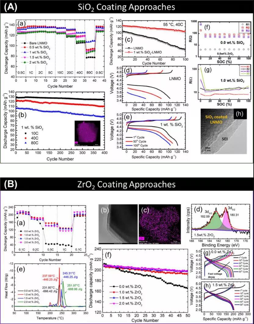 圖4、(A)SiO2包覆LNMO電化學性能(B)ZrO2包覆(NCM)材料電化學性能。