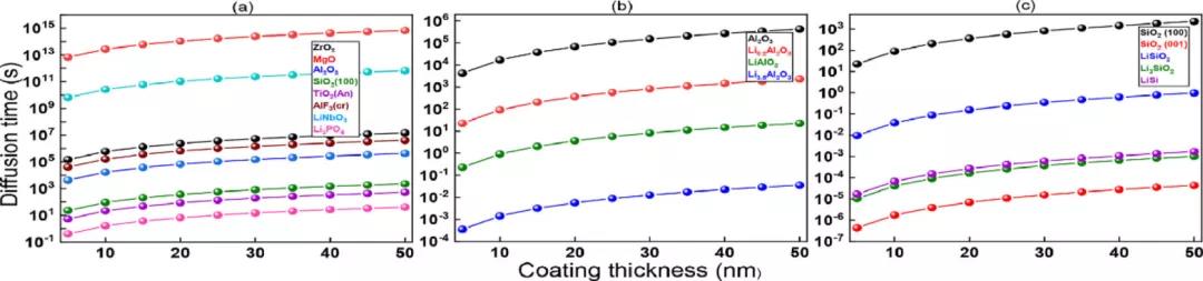 某些表面包覆會阻礙離子擴散,但提供其他優(yōu)勢,而某些包覆可以增強離子擴散,但損害其他性能。在采用包覆時,折衷考慮這些影響一直是電池研究的重點。包覆厚度與包覆層的鋰離子擴散率之間的結構特性相關性是衡量折衷標準的一個有效方法。圖10提供了擴散時間與包覆厚度的關系。大多數氧化物和氟化物的鋰離子擴散率極低。對于較厚的包覆,擴散時間更長。這些表面包覆厚度應小于10nm,以獲得更好的電化學性能。