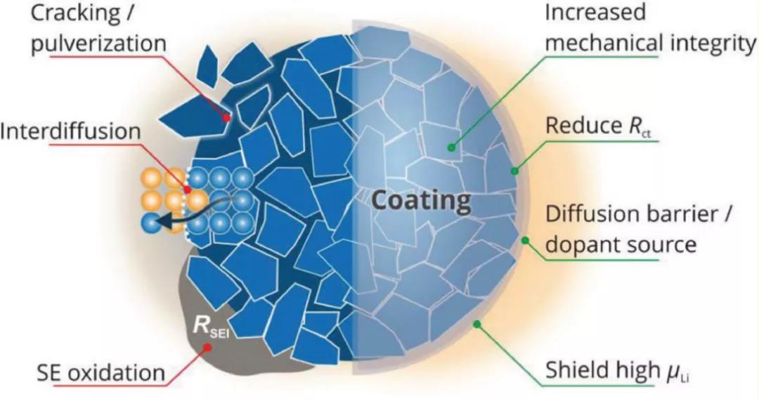 包覆層應均勻且完全覆蓋正極顆粒,并保證正極顆粒之間的接觸以提供導電網絡。硬而脆的包覆層在電極制造過程中易形成裂紋,因此形成顆粒接觸,但可能導致SE分解。如果包覆層是塑性且可變形,則它可以通過變形而形成新的接觸點而不會形成裂紋。表面包覆應抑制或適應正極材料的體積變化,以保持顆粒間的接觸。另外,正極活性材料和SE之間也可能相互擴散。包覆會抑制這種相互擴散,減輕電阻性界面的形成。