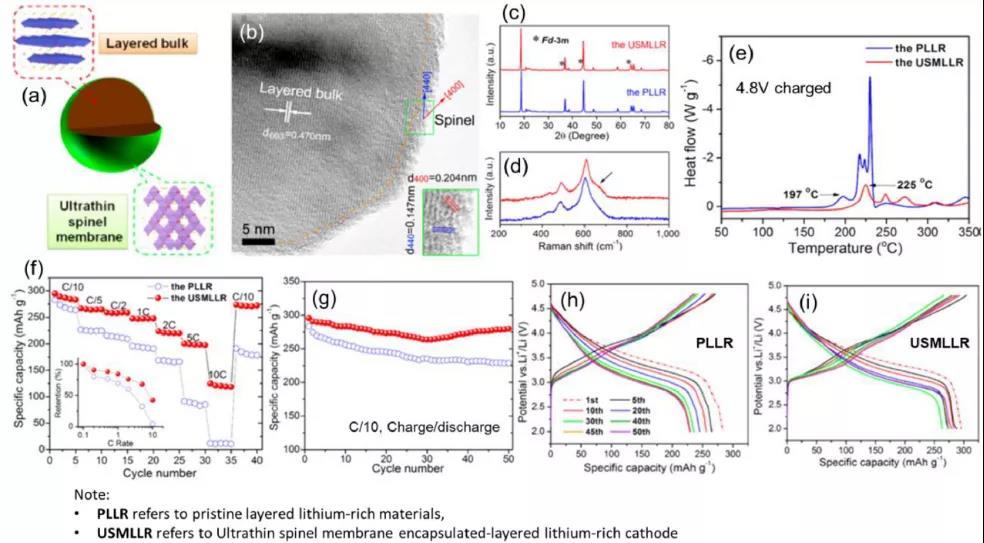 電極材料已被用作正極包覆材料。通常,應將較穩(wěn)定的材料涂覆在較不穩(wěn)定的材料上,以提高材料的整體穩(wěn)定性和性能。好處在于,它們在正極和電解質之間提供了物理阻擋層,抑制了副反應,改善了電荷轉移動力學,使正極材料具有更好的電化學性能。然而,很難實現(xiàn)均勻且薄的電極材料包覆。而且,需要較高的熱處理溫度以形成良好的包覆,可能導致正極材料分解。對于這類包覆,需要選擇最佳的包覆材料和包覆條件。例如,超薄尖晶石(LiMn2O4)包覆的富鋰Li1.2Mn0.6Ni0.2O2層狀氧化物(USMLLR)改善了電化學和熱性能。好處是既保證了富鋰層狀氧化物材料的高容量又提供了較高的倍率性能,同時由于LMO優(yōu)異的Li+電導率而改善了表面處的電荷傳輸。